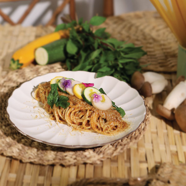 Mì Ý . bí ngòi . nấm đùi gà . phô mai parmesan . trứng nấm truffle . lá quế chiên giòn . sốt rau củ